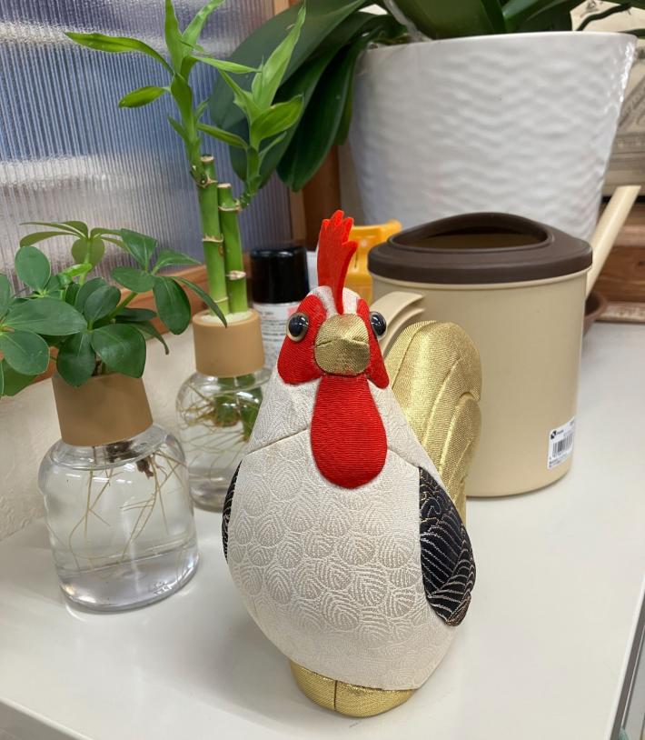 少し離れた下駄箱の上には金の尻尾のニワトリが鎮座して皆の仕事ぶりを見守っています。